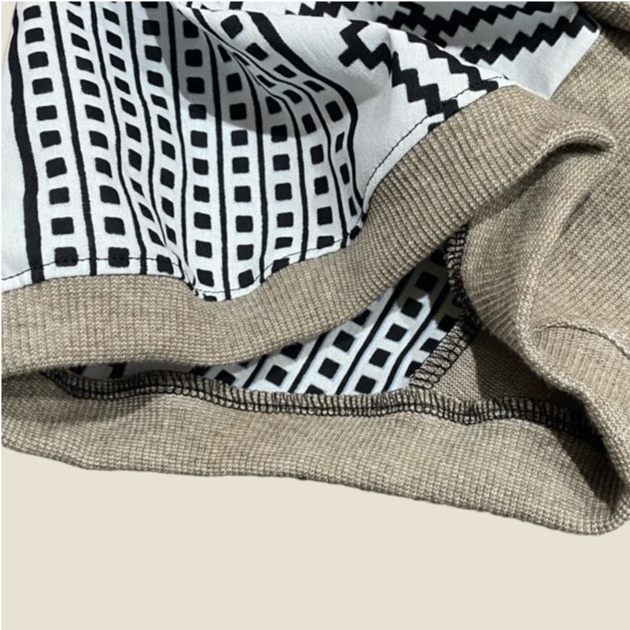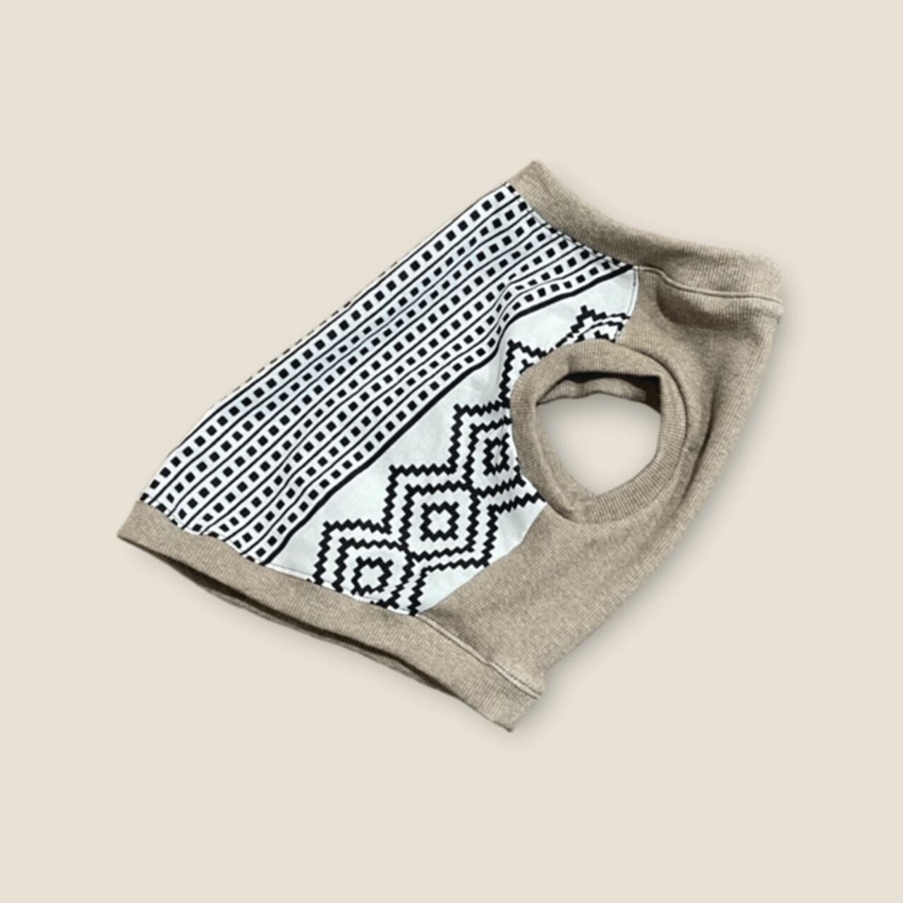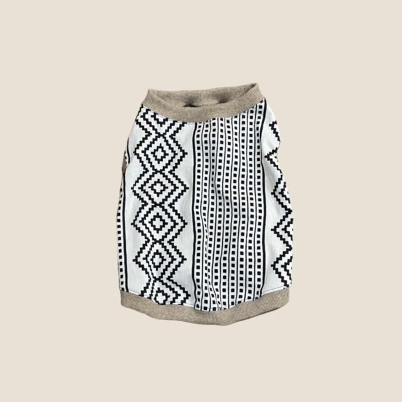 このタンクトップは、幾何学的なロジックデザインが特徴です。メイン生地には個性的なロジック柄を施し、サブ生地はお好みのカラーや素材から選んでいただけます。この組み合わせにより、愛犬にぴったりのスタイルを実現できます。